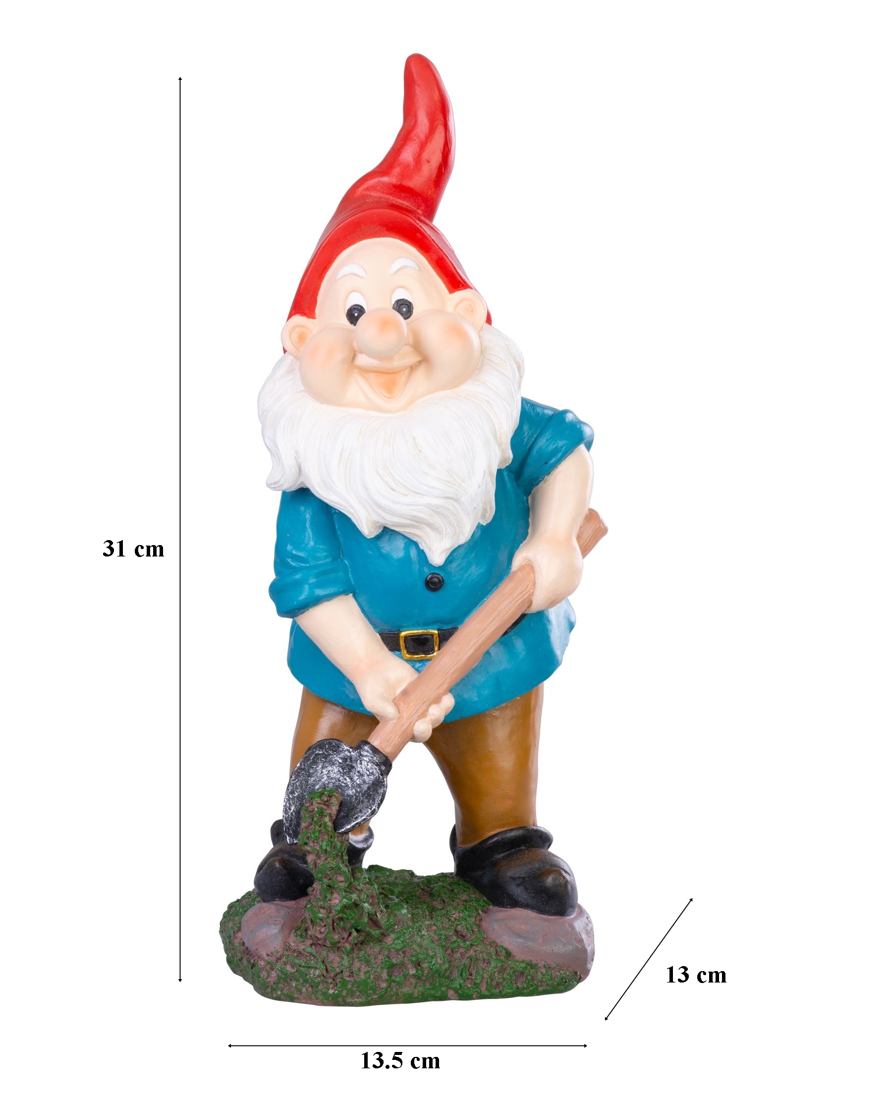 - Decoratiunea pentru gradina prezinta un pitic cu o lopata, realizat din rasina sintetica rezistenta, avand dimensiunile de 13,5 x 13 x 31 cm.