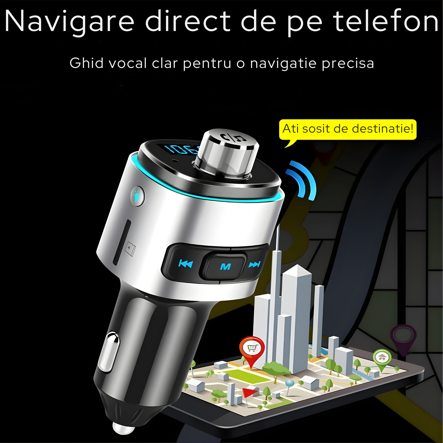 Modulator FM auto cu Bluetooth pentru redare muzica si apeluri hands-free, 2 porturi USB-A pentru incarcare si redare, slot microSD pentru MP3, buton rotativ multifunctional, compatibil Android si iOS, alimentare 12–24 V