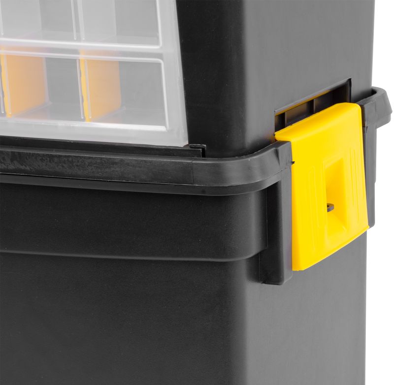 Capacitate de Greutate: Cutia este proiectata sa suporte o greutate maxima de 25 kg, oferind suficient spatiu pentru a transporta o gama variata de scule si accesorii fara a compromite durabilitatea.
