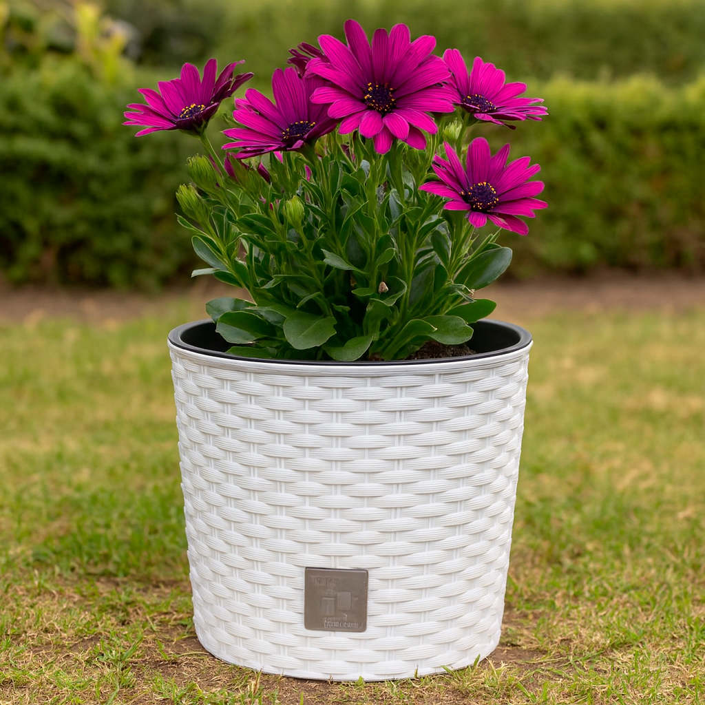 • Ghiveciul rotund alb cu imitatie de ratan este alegerea perfecta pentru orice spatiu modern sau clasic.