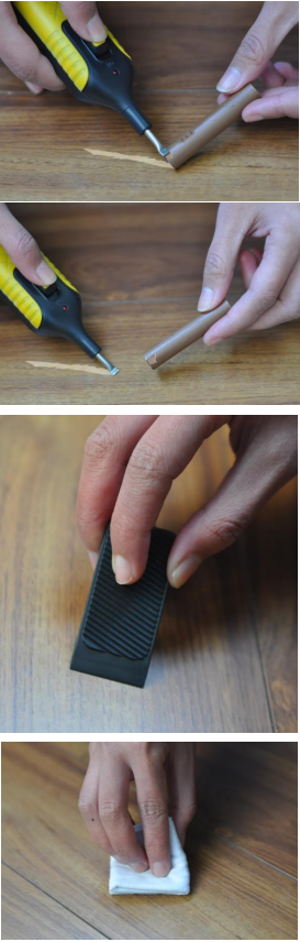Cu ajutorul dispozitivului de topire se pot topi batoanele cerate corectoare de diferite culori si se pot amesteca pentru a obtine o nuanta cat mai apropiata de parchetul dumneavoastra.