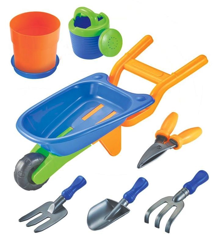 Set compus din: 1 x Roaba – dimensiune masina 25,5 x 56 x 21 cm 1 x cleste 1 x Lopatica 2 x grebla 1 x Stropitoare 1 x galetusa cu farfurie