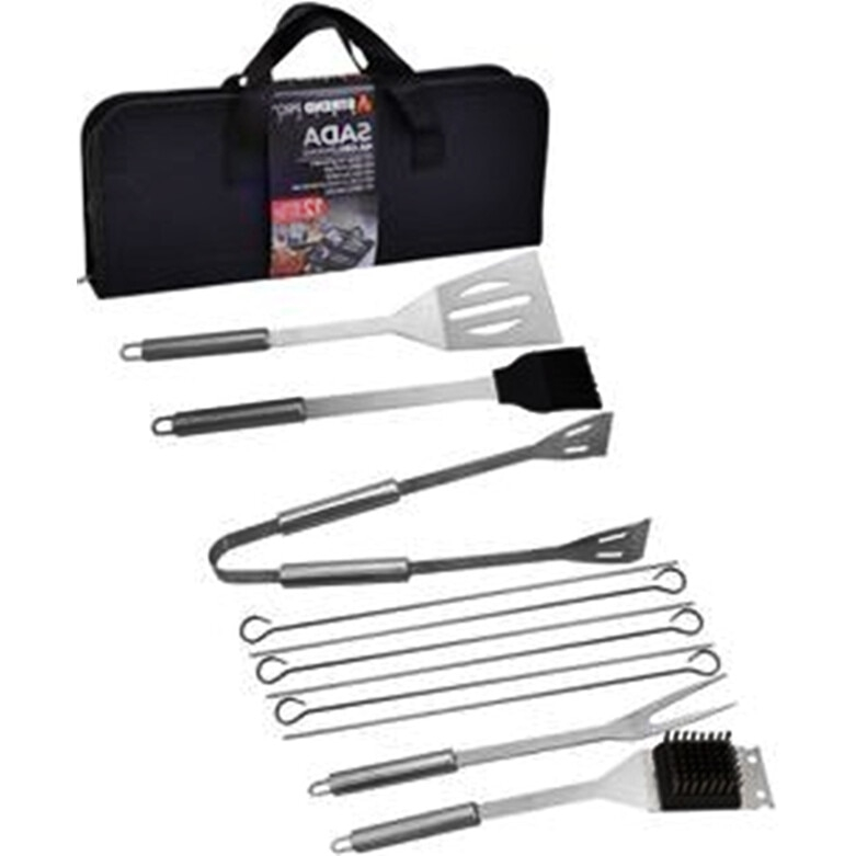 Set 12 ustensile pentru gratar, din otel inoxidabil, in husa de depozitare cu fermoar